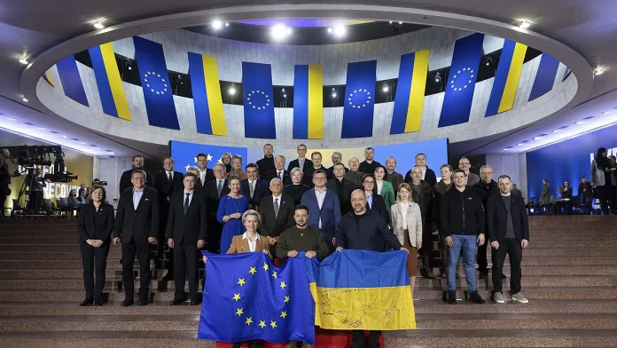 Los Dirigentes de la U.E presentes en la cumbre de Kiev en el tercer aniversario de la guerra desatada por el afán expansionista de la OTAN .